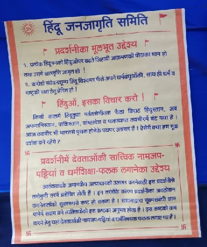ज्यादातर पोस्टर मुस्लिमों को आतंकवादी और वीभत्स रूप में पेश करते हैं। ऐसे वीभत्स चित्र हैं जिन्हें छापा भी नहीं जा सकता। इस पंडाल में पाँच मिनट की एक फ़िल्म दिखाई जाती है जो पूरी तरह बदले की भावना, घृणा और हिंसा को उकसाती है।