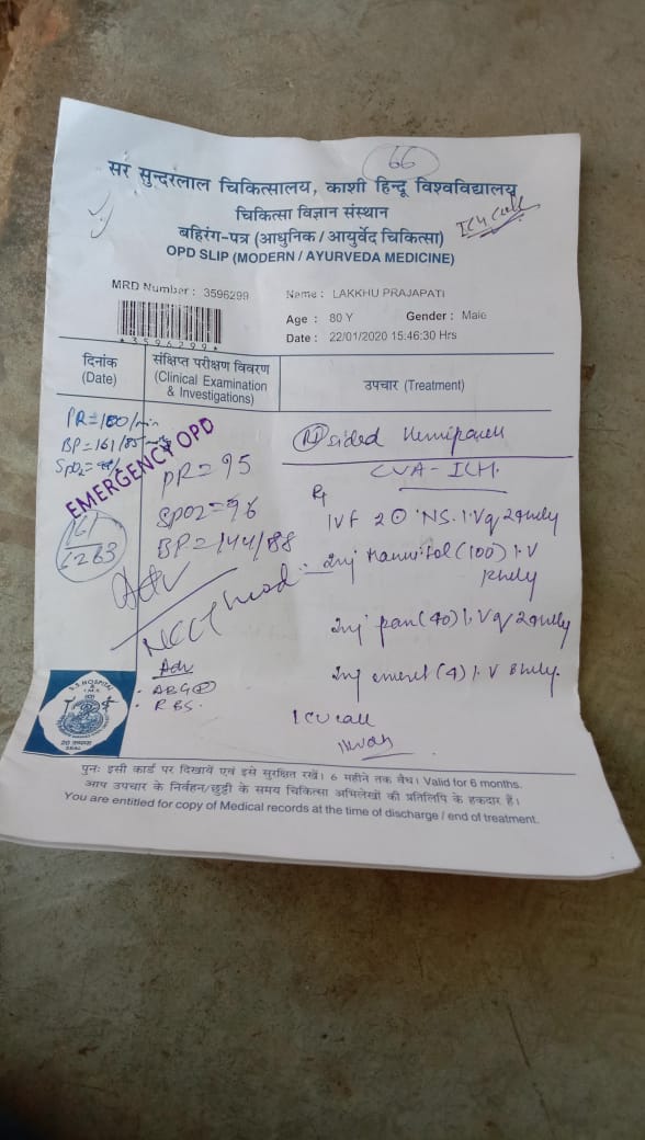 खेती-बाड़ी कर परिवार जीवनयापन करने वाले लक्खू प्रजापति के बेटे राम नारायण प्रजापति बताते हैं, “बीते 22 जनवरी को पिताजी का ब्रैन हैमरेज हो गया तो हम पहले उन्हें स्थानीय पं. कमलापति त्रिपाठी संयुक्त जिला चिकित्सालय ले गये। वहां चिकित्सकों ने उन्हें वाराणसी रेफर कर दिया तो हम उन्हें लेकर बीएचयू अस्पताल ले गये। इमरजेंसी में भर्ती कराया। अगले दिन न्यूरो सर्जन को भी दिखाया तो उन्हें कहा कि अगर चार दिनों तक यह जिंदा रह जाते हैं तो ऑपरेशन के बारे में सोचा जा सकता है। फिलहाल इन्हें अभी वेंटीलेटर पर रखने की जरूरत है लेकिन हमारे यहां वेंटीलेटर खाली नहीं है।”