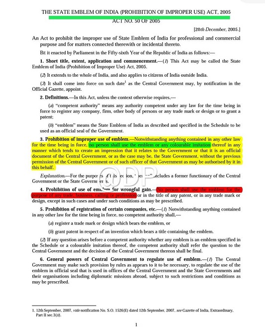 THE STATE EMBLEM OF INDIA (PROHIBITION OF IMPROPER USE) ACT, 2005 की धारा 4 कहती है कि कोई व्यक्ति व्यापार, कारोबार,आजीविका या वृत्ति के प्रयोजन के लिए या किसी डिजाइन में राष्ट्रीय चिन्ह का प्रयोग नहीं करेगा. और इसी एक्ट की धारा 3 राष्ट्रीय प्रतीक या उसकी मिलती-जुलती नकल के प्रयोग को प्रतिबन्धित करती है.