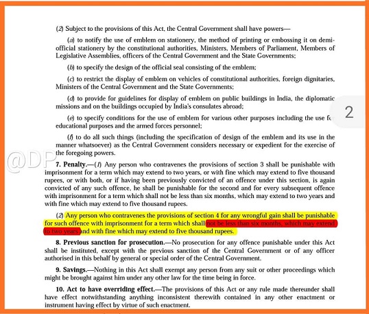 भारत का राजकीय संप्रतीक अनुचित प्रयोग अधिनियम 2005 की धारा 7(2) के मुताबिक धारा 4 के उल्लंघन पर कम से कम 6 महीने की जेल,जो 2 साल तक बढ़ाई जा सकती है की सजा का प्रवधान है. पांच हजार तक का जुर्माना भी लगाया जा सकता है.