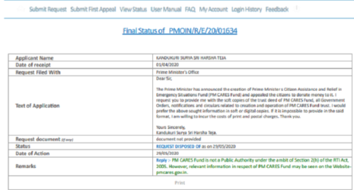 कोरोना महामारी से लड़ने के लिए बनाये गए पीएम केयर्स फंड पर शुरू से ही सवाल खड़े किये जा रहे हैं। एक अप्रैल 2020 को हर्षा कांदुकुरी द्वारा पीएम केयर्स फंड से संबंधित जानकरी प्राप्त करने के लिए आरटीआई दाख़िल की गयी थी। प्राइम मिनिस्टर ऑफिस (पीएमओ) ने इस जानकरी को देने से इंकार कर दिया और कहा कि यह पब्लिक अथॉरिटी नहीं है, इसलिए आरटीआई के अंतर्गत इसकी जानकारी नहीं दी जा सकती। दरअसल अज़ीम प्रेम जी यूनिवर्सिटी में लॉ की पढाई कर रही हर्षा कांदुकुरी ने आरटीआई के तहत पीएम केयर्स फंड की ट्रस्ट डीड, संचालन और इसके निर्माण से जुड़े अन्य सरकारी आदेशों और अधिसूचनाओं की जानकारी मांगी थी। जिसके जवाब में पीएमओ से जवाब आया कि पीएम केयर्स फंड सूचना के अधिकार अधिनियम. 2005 की धारा 2 (H) के दायरे में नहीं आता। पीएम केयर्स फंड सार्वजनिक प्राधिकरण नहीं है। हालांकि इसके बारे में pmcares.gov.in उपलब्ध जानकारी देखी जा सकती है।