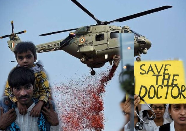 भारतीय सेना ने चिकित्साकर्मियों के सम्मान में बैंड से सलामी धुन बजाई, भारतीय वायुसेना ने अस्पतालों पर फूलों की पंखुड़ियां बरसाई और भारतीय सेनाओं के शौर्य, निष्ठा, देशप्रेम पर कोई नागरिक ज़रा सी भी शंका नहीं कर सकता। लेकिन क्या भारतीय सेनाओं के हेलीकॉप्टर्स से गिर रही फूलों की पंखुड़ियों का इस्तेमाल – सरकार सवालों को ढंकने के लिए कर रही है? क्योंकि दरअसल देश के चिकित्साकर्मियों की ओर से कोविड 19 संक्रमण की शुरुआत से ही जो मांगें की जा रही थी, वे शिकायतों में बदलकर, अब उनकी त्रासदी तक आने लगी हैं। तो क्या दुनिया के दूसरे देशों में हो रही इस तरह की आभार गतिविधियों की नकल भर कर के, सबकुछ ठीक किया जा सकता है?
