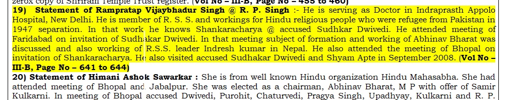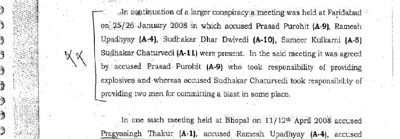 भगवा आतंकवाद की जांच के सिलसिले में पुलिस को दयानंद के लैपटॉप से कुछ टेप हासिल हुए थे जिनमें ऐसी कई बैठकों का विवरण था। जनवरी 2009 में महाराष्ट्र एटीएस ने मकोका अदालत में मुंबई में जो चार्जशीट मालेगांव मामले में जमा की थी, उसमें फरीदाबाद के कश्मीरी पंडितों के एक मंदिर में हुई इस बैठक का उल्लेख है। चार्जशीट कहती है कि उस बैठक में भाजपा के नेता और दो बार के सांसद रहे बीएल शर्मा ‘प्रेम’ के अलावा उत्तर प्रदेश के आरएसएस प्रचारक राजेश्वर सिंह (आगरा और अलीगढ़ में घर वापसी कार्यक्रम के लिए कुख्यात और फिलहाल पश्चिमी यूपी के संघ प्रभारी), दिल्ली से हिंदू महासभा के सदस्य अयोध्या प्रसाद त्रिपाठी, अभिनव भारत के समीर कुलकर्णी, सुधाकर चतुर्वेदी, पुरोहित, कर्नल धर और रिटायर्ड मेजर रमेश उपाध्याय मौजूद थे।
