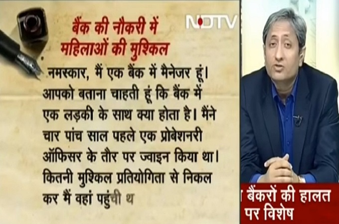 युनिवर्सिटी और नौकरी सिरीज़ के बाद रवीश कुमार अपने प्राइम टाइम पर बैंकों पर फ़ोकस कर रहे हैं। इस सिरीज़ से बैंकों और बैंककर्मियों की जैसी हालत सामने आ रही है वह यक़ीन के बाहर है। ख़ास बात यह है कि इस सिरीज़ की कहानियाँ बैंककर्मियों की ओर से ही एनडीटीवी को भेजी जा रही हैं। बैंक कर्मियों के बीच इस सिरीज़ को लेकर बहुत उत्साह है। वे चाहते हैं कि ज़्यादा से ज़्यादा लोग इसे देखें। वे व्हाट्सऐप पर एक मैसेज भी इस सिलसिले में प्रसारित कर रहे हैं…