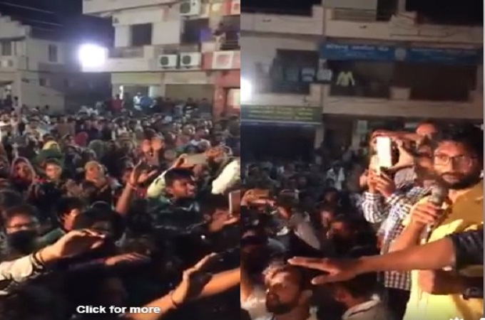 नीचे एक वीडियो है सुरेंद्रनगर जिला का। कल रात करीब 9 बजे लखपत तहसील बाज़ार में बने मंच पर जिग्नेश हैं और नीचे बड़ी तादाद में लोग खड़े हैं।जिग्नेश शपथ दिलाते हैं और लोग हाथ उठाकर उसे दोहराते हैं। गुजरात के राजनीतिक परिदृश्य में यह बिलकुल नई बात है। यह बात है- किसी समुदाय का यूँ जीवन भर बीजेपी को वोट न देने की सार्वजनिक रूप से शपथ लेना।