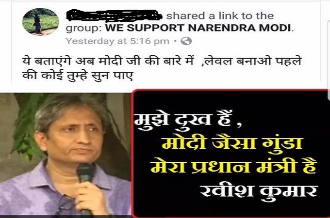 यही कोशिश मेरे नाम से प्रधानमंत्री को गुंडा कहना जोड़कर की जा रही है। पहले किसी ने यू ट्यूब पर मेरे ही भाषण का कैप्शन लगाया और अब व्हाट्स अप पर इसे चलाया जा रहा है। मैंने आनलाइन जगत के एक हिस्से को गुंडा और हत्यारा ज़रूर कहा है। प्रधानमंत्री के लिए कभी ऐसे शब्द का इस्तमाल नहीं किया है। जो भी मुझे बदनाम के करने के लिए ऐसा कर रहा है वह लोगों को प्रधानमंत्री को देखने का एक नज़रिया दे रहा है। उनका अपमान कर रहा है। मैंने इस तरह के काम करने वालों को गुंडा कहा है, अभी भी कह रहा हूँ न कि प्रधानमंत्री को ।