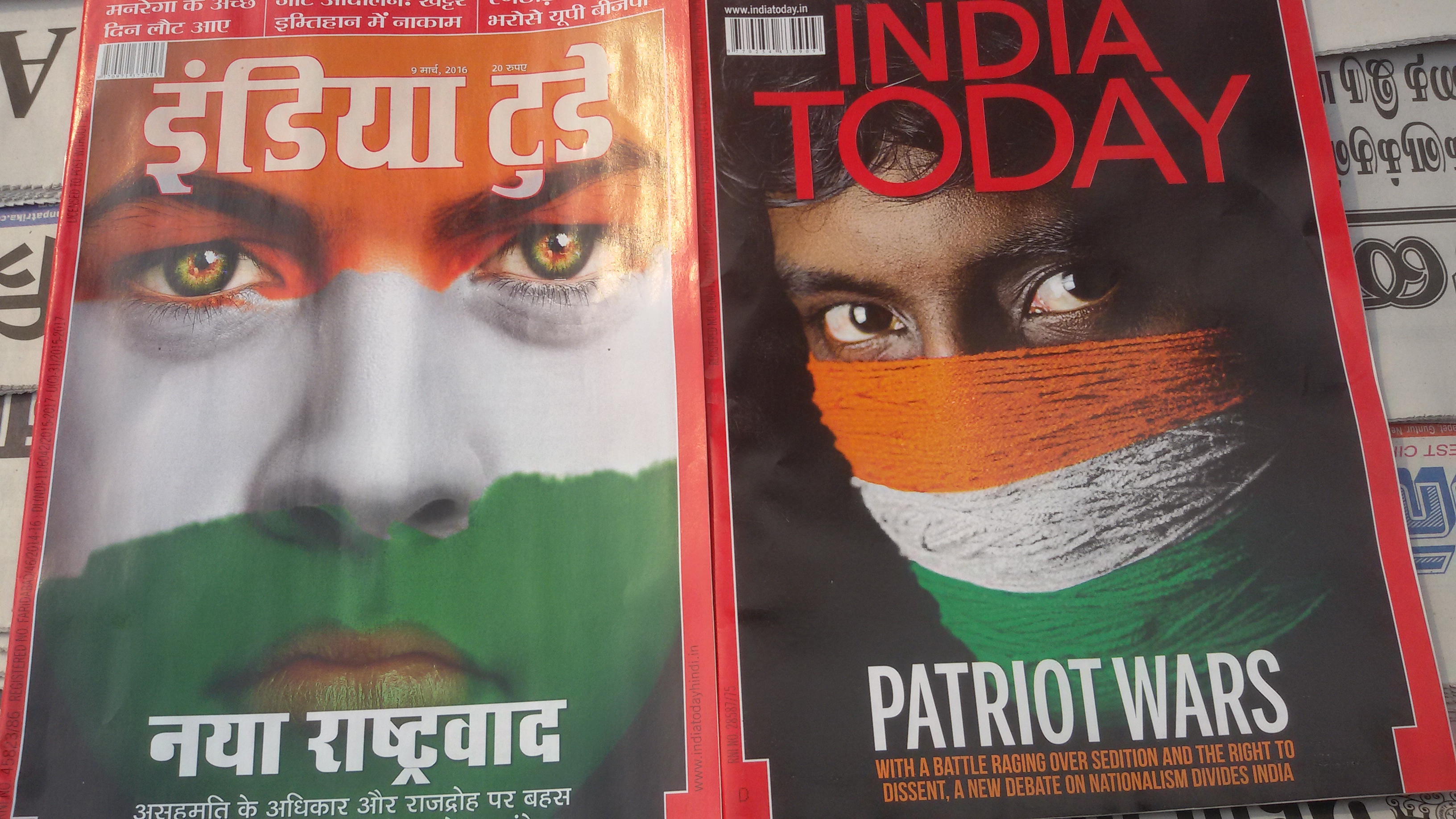 ‘इंडिया टुडे’ का ताज़ा अंक राष्ट्रवाद को लेकर जारी बहस पर केंद्रित है। लेकिन अंग्रेज़ी और हिंदी संस्करण के कवर पेज पर छपे चित्रों में ऐसा फ़र्क़ है जो बहुत कुछ कहता है। अंग्रेज़ी इंडिया टुडे के कवर पर जो चेहरा है उसके मुंह पर तिरंगे धागों की पट्टी है। यह तस्वीर राष्ट्रवाद के नाम पर जारी फ़ासीवादी अभियान को सटीक ढंग से पेश करती है।