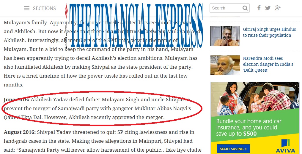 चार दिन पहले यानी 20 अक्टूबर की दोपहर में फाइनेंशियल एक्सप्रेस की वेबसाइट पर मुलायम सिंह के परिवार में चल रहे संकट पर एक ख़बर प्रकाशित हुई थी। ख़बर राजीव कुमार की बाइलाइन से है। ख़बर में मुलायम के कुनबे के संकट की टाइमलाइन दी हुई है जिसकी शुरुआत जून 2016 से होती है जिसमें गैंगस्टर मुख्तार अंसारी की पार्टी कौमी एकता दल के साथ समाजवादी पार्टी के विलय से अखिलेश यादव के इनकार का जि़क्र है।