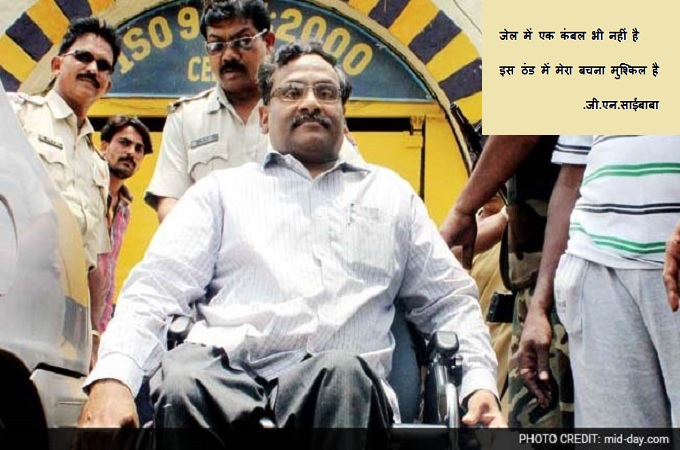 मार्च में गढ़चिरौली, महाराष्ट्र की एक अदालत ने दिल्ली विश्वविद्यालय के शिक्षक प्रो. जी.एन.साईबाबा को दस साल क़ैद की सज़ा सुनाई थी। एक कॉलेज में अंग्रेजी पढ़ाने वाले साईबाबा 90 फ़ीसदी तक विकलांग हैं और उनका सारा समय व्हील चेयर पर बीतता है। उन पर आरोप है कि उन्होंने माओवादियों की मदद की और राज्य के ख़िलाफ़ युद्ध छेड़ा। 90 फ़ीसदी तक विकलांग और तमाम बीमारियों से घिरे साईबाबा किस तरह राज्य के ख़िलाफ़ युद्ध छेड़ सकते हैं, इस पर बहुत सी बात हो सकती है लेकिन कोई फ़ायदा नहीं। फ़ैसला तो ऊपरी अदालतें ही करेंगी। लेकिन जिस संविधान और क़ानून के नाम पर उन्हें सज़ा दी गई है, उसी का निर्देश है कि जेलों में क़ैदियों को मनुष्य मानकर रखा जाए। सज़ा का मतलब मानवीय गरिमा से च्युत करना नहीं है। जेल मैनु्अल क़ैदियों की सुविधाओं की व्यवस्था करने का स्पष्ट निर्देश देता है। लेकिन बीमार साईबाबा जेल में एक कंबल तक को तरस रहे हैं और उन्हें लगता है कि इस ठंड में वे ज़िंदा नहीं बचेंगे। यह बात उन्होंने अपनी पत्नी को संबोधित एक पत्र में कही है। यह पत्र जनज्वार डॉट कॉम पर प्रकाशित हुआ है। वहां से साभार यह पत्र हम यहाँ छाप रहे हैं। यह पत्र बताता है कि भारतीय जेल व्यवस्था सभ्यता की सामान्य कसौटियों पर भी खरा नहीं उतरती। पढ़िए साईबाबा का यह पत्र…