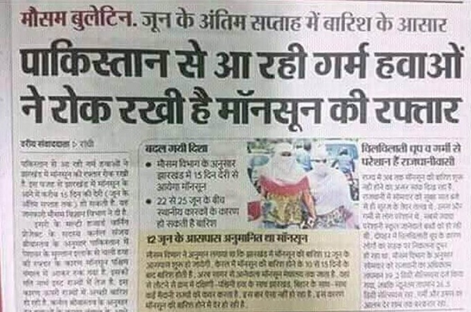 एक अख़बार में प्रकाशित ख़बर के अनुसार पाकिस्तान से उठ रही गर्म हवाओं ने मानसून को रोके रखा है। हिंदी पट्टी को बेवक़ूफ़ समझना और उसे बेवक़ूफ़ बनाए रखना ही उद्देश्य है इस समाचार का। कुछ साल पहले एक टीवी कार्यक्रम आता था ‘क्या आप पाँचवीं क्लास से तेज़ हैं’। उस प्रोग्राम में एक प्रतिभागी से पूछा गया कि लखनऊ दिल्ली से किस दिशा में है। वह प्रतिभागी नहीं ही बता पाया।
