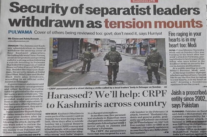 वैसे तो आज के लगभग सभी अखबारों में कश्मीर के अलगाववादी (हिन्दुस्तान), पाक परस्तों (दैनिक भास्कर) की सुरक्षा छीने जाने और सुरक्षा से ‘आजादी’ (नवभारत टाइम्स) की खबर है पर हिन्दुस्तान टाइम्स का पहला पन्ना सबसे खास है। हिन्दुस्तान टाइम्स ने इस खबर को पांच कॉलम में छापा है। शीर्षक है, तनाव बढ़ा तो अलगाववादी नेताओं की सुरक्षा वापस ली गई। उपशीर्षक है, सरकार ने कहा, दूसरों की सुरक्षा की समीक्षा की जा रही है, हुर्रियत ने कहा, आवश्यकता नहीं है। कश्मीर में सीआरपीएफ पर हमला और 40 से ज्यादा जवानों की मौत के बाद देश भर में जो माहौल बना उसका असर कश्मीर के बाहर रह रहे कश्मीरियों पर पड़ा। उनपर हमले औऱ परेशान किए जाने की खबरे अखबारों और सोशल मीडिया में भी थीं। दैनिक जागरण में इससे अलग खबर है।