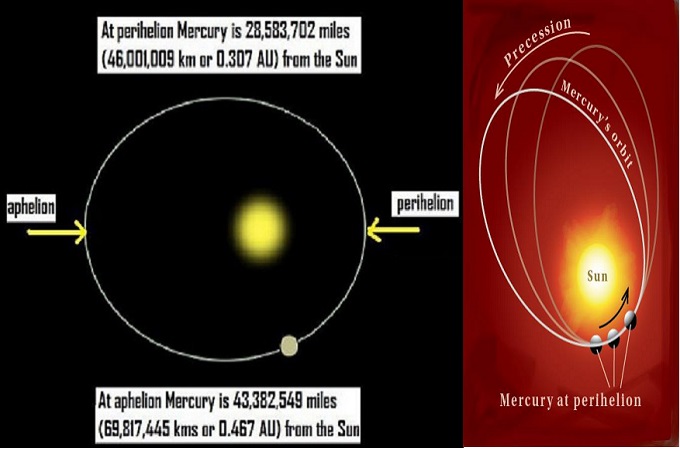 आइंस्टीन के सापेक्षता के सिद्धान्त के अनुसार बुध का कक्षा-वृत्त सूर्य के चारों ओर बिलकुल ठीक और सटीक चलता पाया गया।