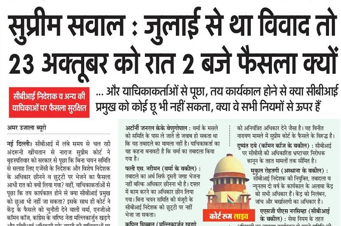 दैनिक जागरण में यह खबर तीन कॉलम में लीड है। फ्लैग शीर्षक है, “आलोक वर्मा की याचिका पर सुप्रीम कोर्ट का फैसला सुरक्षित, पूछा सीबीआई प्रमुख को क्या कार्यकाल तय होने से नहीं छू सकते”। यहां सरकार से पूछा गया सवाल नहीं, याचिकाकर्ताओं से पूछा गया सवाल महत्वपूर्ण हो गया है। ऐसा लग रहा है जैसे रात दो बजे हटाना कोई मुद्दा ही नहीं है। इस खबर के साथ और जो खबरें हैं वो भी ऐसी ही हैं। एक का शीर्षक है, वर्मा और अस्थाना में रातों रात लड़ाई नहीं छिड़ी- कोर्ट, और दूसरी एक-दूसरे के खिलाफ जांच कर रहे थे अफसर- सीवीसी। सीबीआई में घमासान शीर्षक के तहत दो बिन्दु है, सीवीसी ने वर्मा से कामकाज छीने जाने के आदेश को सही ठहराया और दूसरा, कहा – विशेष हालत में विशेष इलाज जरूरी।