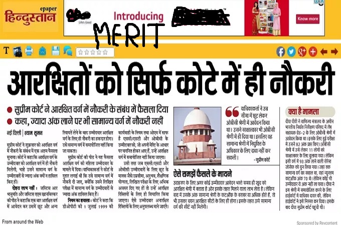 नई दिल्ली से प्रकाशित हिंदी समाचार पत्र दैनिक हिंदुस्तान ने 22 अप्रैल, 2017 को पहले पन्ने पर एक खबर प्रकाशित कर सनसनी फैला दी। खबर में सुप्रीम कोर्ट द्वारा कथित तौर पर 21 अप्रैल को दिए गए एक अहम फैसले के हवाले से कहा गया कि “आरक्षित वर्ग के उम्मीदवार को आरक्षित वर्ग में ही नौकरी मिलेगी, चाहे उसने सामान्य वर्ग के उम्मीदवारों से ज्यादा अंक क्यों न हासिल किए हों।” अखबार की इस खबर ने जहां सामाजिक न्याय के पक्षधर कार्यकर्ताओं को बेचैन कर दिया वहीं यूथ फार इक्वलिटी जैसे मनुवादी संगठनों से जुडे लोग खुशी से झूम उठे।