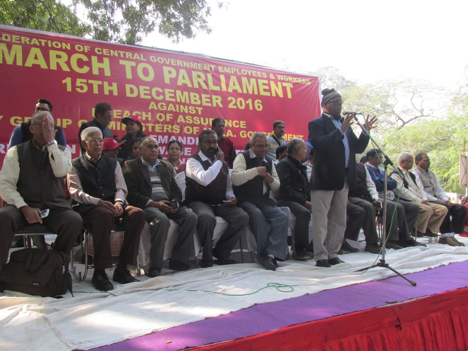 केंद्रीय कर्मचारी परिसंघ ने सातवें वेतन आयोग के संबंध में और अन्य मांगों को लेकर 15 दिसंबर को दिल्ली के संसद मार्ग पर एक विशाल रैली बुलाई थी। इस रैली की तैयारी से परेशान होकर केंद्र सरकार ने पिछले महीने परिसंघ को कुछ आश्वासन दिए थे जिससे वह बाद में मुकर गई। इसीलिए रैली के बैनर पर अरुण जेटली, राजनाथ सिंह और सुरेश प्रभु- तीनों केंद्रीय मंत्रियों के द्वारा विश्वासघात की बात लिखी गई थी।