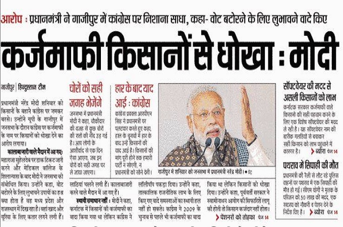 कल ही के अखबारों में एक और खबर चर्चा योग्य थी। इसे हिन्दुस्तान ने लीड बनाया। कर्जमाफी किसानों से धोखा : मोदी। शीर्षक से ही स्पष्ट है कि यह मोदी यानी प्रधानमंत्री नरेन्द्र मोदी का आरोप है। आरोप को लीड बनाना चाहिए कि नहीं इसपर अलग राय हो सकती है। लेकिन प्रधानमंत्री कोई आरोप लगाएं तो उसका महत्व है और उसे लीड बनाना निष्पक्ष पत्रकारिता के लिहाज से गलत नहीं है। इसके मुकाबले राहुल या कांग्रेस के आरोपों को वह महत्व नहीं दिया जाए तो भी मैं गलत नहीं मानूंगा। हिन्दुस्तान ने तो फ्लैग शीर्षक में ही ‘आरोप’ लिख दिया है। इसके साथ लिखा है, “प्रधानमंत्री ने गाजीपुर में कांग्रेस पर निशाना साधा, कहा – वोट बटोरने के लिए लुभावने वादे किए”। हालांकि, इसके साथ अखबार ने कांग्रेस का जवाब भी छापा है, “हार के बाद याद आई (किसानों की) : कांग्रेस”। इसके साथ सिंगल कालम में प्रधानमंत्री का एक और दावा है, चोरों को सही जगह भेजेंगे। पता नहीं कांग्रेस ने इसपर कुछ कहा कि नहीं। अखबार में नहीं है। अगर कहा हो तो उसे भी यहीं होना चाहिए था। नहीं कहा हो तो यह कांग्रेस का मामला है।