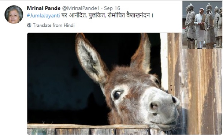 इन सवालों को पूछने से पहले मृणाल जी के वाक़्य पर ग़ौर किया जाना चाहिए। इसमें वैशाखनंदन यानी गधे को ख़ुश बताया जा रहा है ‘जुमलाजयंती’ पर। यानी जयंती इस गधे की नहीं है, जुमला बोलने वाले की है। यानी वह इस गधे से अलग कोई विभूति है जो जुलमेबाज़ है। अगर मान लिया जाए कि जुमला बोलने वाले के रूप में मोदी जी की ओर ही इशारा है, तो इस ट्वीट में दर्ज वैशाखनंदन वह कैसे हो सकते हैं ! (वैसे, यह ट्वीट 16 सितंबर का है जबकि मोदी जी का जश्ने यौमे पैदाइश, माफ़ कीजिए शुभ जन्मोत्सव 17 सितंबर को था।)