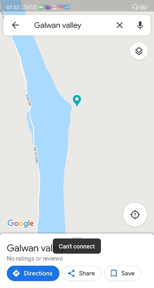 ज़ाहिर है कि लाइव स्ट्रीमिंग ख़त्म होते ही, हमने इसको फिर से सर्च करना चालू किया। पर्सनल कम्प्यूटर पर नाकाम रहने के बाद, हमने मोबाइल पर गूगल मैप्स के एप्लीकेशन में ये ही सर्च दोहराने का फैसला किया। हम हैरान थे कि गूगल मैप्स के एप्लीकेशन पर ‘Galwan Valley’ सर्च करने पर सबसे पहले Can’t Connect (जोड़ने में अक्षम) का नोटिफिकेशन स्क्रीन पर आकर गायब हो गया।