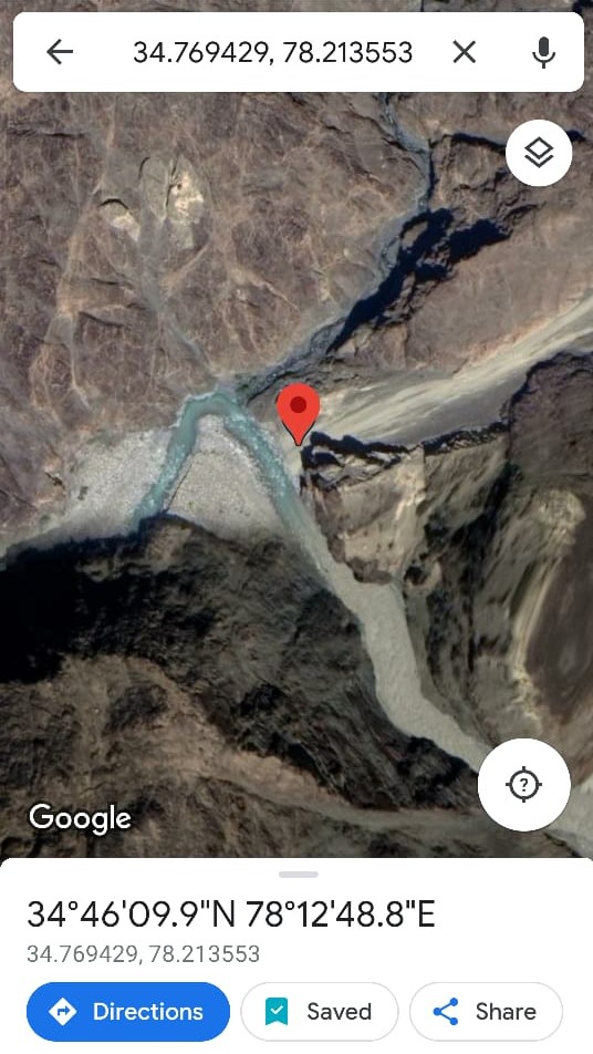 नहीं, ऐसा भी नहीं है…गूगल मैप्स पर ये लोकेशन अभी भी है। हमने अपनी याद्दाश्त और पिछले मैप्स के ज़रिए, अंदाज़ा लगाते हुए गूगल मैप्स पर ये लोकेशन ढूंढनी शुरु की। आख़िरकार हम उस यू शेप में मुड़ती नदी वाली छोटी सी घाटी को खोज लिया और हम कन्फर्म थे कि ये ही गलवान वैली है। हमने इसके नेवीगेशन को-ऑर्डिनेट्स (लौंगीट्यूड और लैटीट्यूड) यानी कि अक्षांश और देशांतर नोट किए और अपने साथियों को फिर से ये जानकारी भेज कर, इसे गूगल मैप्स में सर्च करने को कहा। हम बिल्कुल सही थे, इसके ज़रिए गलवान वैली को, गूगल मैप्स पर ढूंढा जा सकता था।