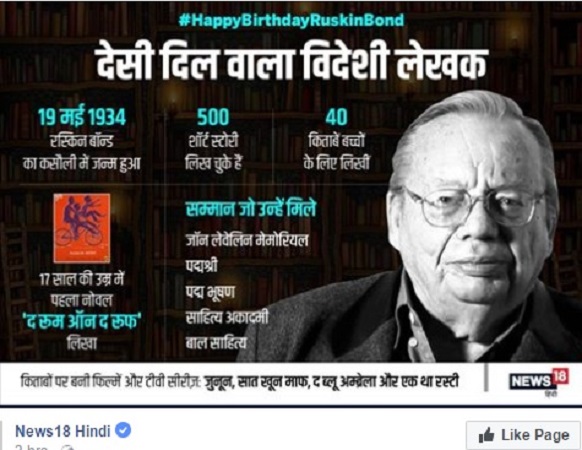 बहरहाल, न्यूज़ 18 की नज़र में रस्किन बॉन्ड ‘विदेशी लेखक’ हैं। वेबसाइट पर बॉन्ड के जन्मदिन पर तमाम जानकारियों से सजे लेख की हेडलाइन में उन्हें साफ़-साफ़ ‘विदेशी’ बताया जा रहा है।