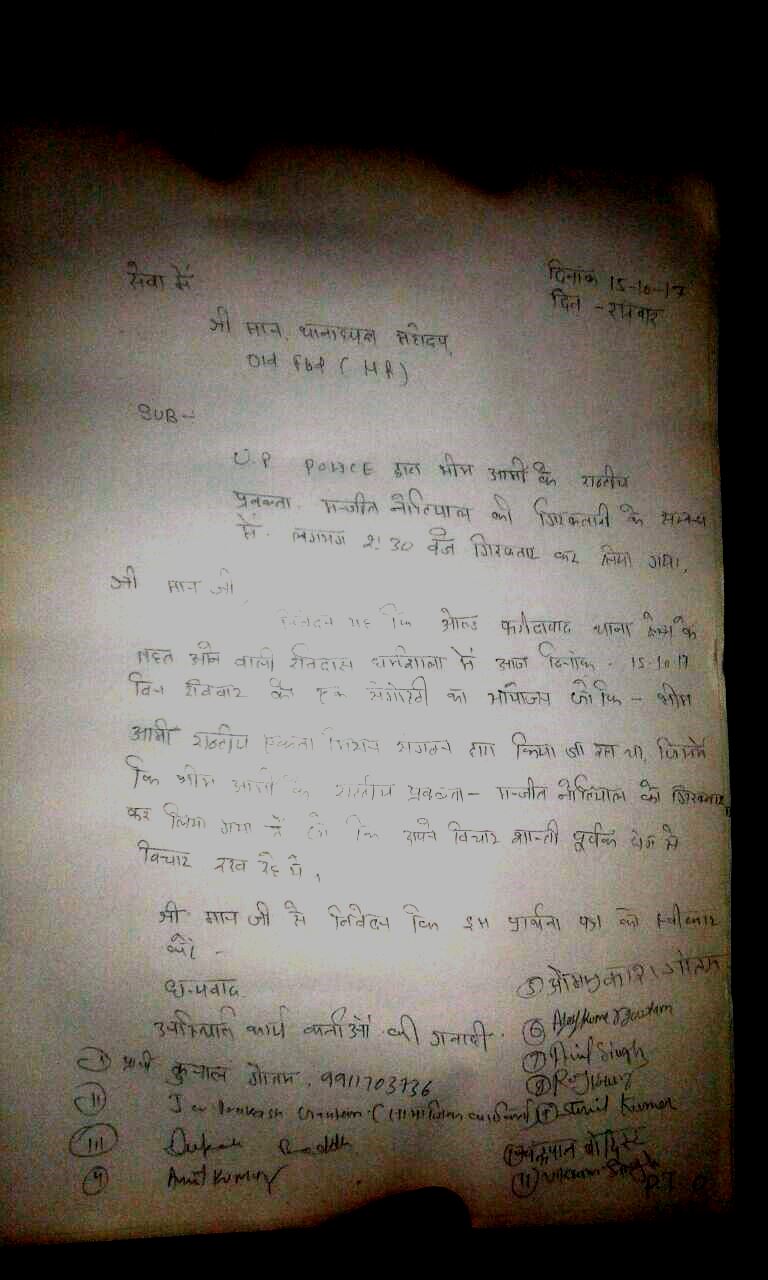 भास्कर की खबर में भीम आर्मी के जिलाध्यक्ष कुणाल गौतम की ओर से पुलिस में जमा एक शिकायत का जिक्र है, जो इस बात का साक्ष्य है कि कार्यक्रम से ही मंजीत को उठाया गया था। शिकायत 15 अक्टूबर को ही की गई थी और इसे ओल्ड फरीदाबाद के थानाध्यक्ष के नाम लिखा गया था जिसमें कहा गया था कि यूपी पुलिस मंजीत को गिरफ्तार कर के ले गई है।