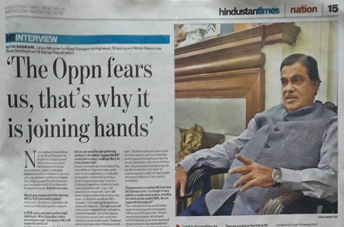 आज के अखबारों में मैंने सबसे पहले हिन्दुस्तान टाइम्स देखा और इसके पहले पन्ने के अधपन्ने पर ‘इलेक्शन 2019’ के तहत अंदर के पन्नों की तीन ‘खबरों’ का शीर्षक और उनका मामूली विस्तार है। दो खबरें पेज आठ की और एक पेज 15 का है। इनमें एक अनूदित शीर्षक है, “हम ’14 के मुकाबले मजबूत लग रहे हैं इसलिए विपक्ष एकजुट हो रहा है : गडकरी”। भाजपा की तरफ से यह कोई नया दावा नहीं है और प्रधानमंत्री नरेन्द्र मोदी तथा अमित शाह इस विषय पर बोलते रहे हैं और इस पर काफी कहा-लिखा जा चुका है। पहले पन्ने पर प्रकाशित ‘खबर’ में कहा गया है कि केंद्रीय मंत्री नितिन गडकरी ने एक इंटरव्यू में हिन्दुस्तान टाइम्स से यह बात कही। अंदर यह इंटरव्यू नितिन गडकरी की चार कॉलम की फोटो के साथ आठ कॉलम में है। अखबार के एक पन्ने पर लगभग 70 प्रतिशत में प्रकाशित इस इंटरव्यू के नीचे एक साथ तीन विज्ञापन है। शीर्षक चार कॉलम तीन लाइन में है। (ऊपर तस्वीर देखें)