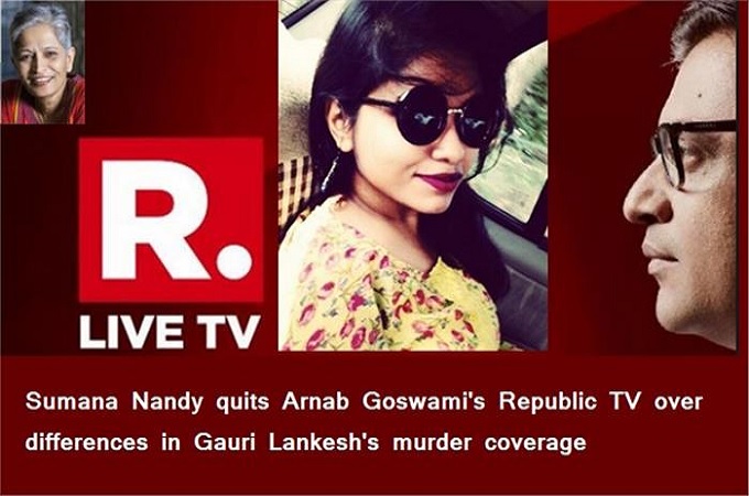 ठीक उसी वक़्त जब तमाम स्वनामधन्य पत्रकार रिपब्लिक टीवी के रिपोर्टर को डपटने के लिए शेहला राशिद की लानत-मलामत में जुटे हैं, ख़ुद रिपबल्कि टीवी की एक पत्रकार ने बता दिया कि रिपबल्कि टीवी दरअसल क्या है। सुमना नंदी नाम की इस पत्रकार ने चैनल से इस्तीफ़ा दे दिया। वह गौरी लंकेश की हत्या के बाद हो रहे चैनल के कवरेज और उसके अंदाज़ से बेहद आहत है।