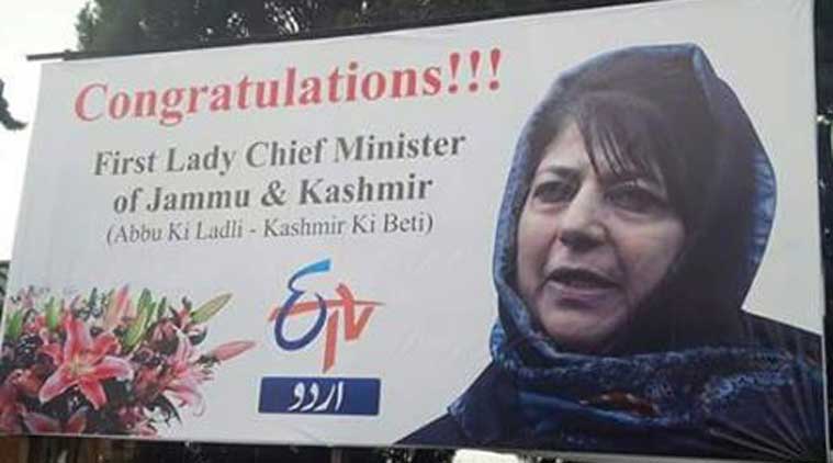 सोमवार यानी 4 अप्रैल को महबूबा मुफ़्ती के शपथग्रहण से पहले ईटीवी की ओर से जम्मू और श्रीनगर में ‘’अब्बू की लाडली’’ और ‘’कश्मीर की बेटी’’ महबूबा मुफ़्ती को सूबे की पहली महिला मुख्यमंत्री बनने की बधाई देते हुए बड़ी-बड़ी होर्डिंग्स लगवाई गईं थीं।