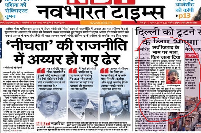कहीं ऐसा तो नहीं कि लव जिहाद के नाम पर चल रहे दुष्प्रचार से एक शख्स के हत्यारे में बदल जाने की ख़बर उस मीडिया को आईना दिखा रही है जो इसे लगातार हवा देता रहा है। ‘नीचता विमर्श’ की आड़ में इस इस अहम ख़बर को ढँकने की कोशिश ऊँची हरक़त तो नहीं कही जाएगी।