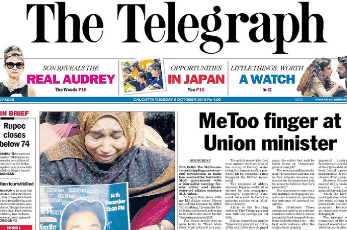 अखबार ने लिखा है मीटू का अभियान गए साल शुरू होने के बाद गए हफ्ते फिर से शुरू हुआ है और उसमें अकबर पहले लोक सेवक हैं जिसका नाम आया है। समाचार पोर्टल फर्स्ट पोस्ट में एक अनाम लेखिका ने मुंबई स्थित एक होटल के कमरे में एक राष्ट्रीय दैनिक के संपादक के दुराचार का वर्णन किया है। लेखिका ने संपादक का नाम नहीं लिखा है पर यह बताया है कि वे एक महत्वपूर्ण सरकारी पद पर हैं। विवरण के अंत में कहा गया है मैं इस माहौल में उनका नाम नहीं ले सकती क्योंकि अपने महत्वपूर्ण काम के मद्देनजर वे समझते हैं के वे सुरक्षित है। टेलीग्राफ की खबर में हिन्दुस्तान टाइम्स के प्रशांत झा के इस्तीफे की सूचना के साथ बताया गया है कि एक आंतरिक सूचना में टाइम्स ऑफ इंडिया ने कहा है कि हैदराबाद के स्थानीय संपादक, केआर श्रीनिवास से वाजिब और निष्क्ष जांच सुनिश्चित करने के लिए छुट्टी पर जाने के लिए कहा गया है।