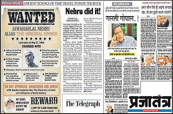 इस मामले में द टेलीग्राफ अलग है। आज की लीड का फ्लैग शीर्षक है, जिम्मेदारी टालने के लिए टाइम ट्रैवेल (समय बदलना) के पुरातन विज्ञान को नए सिरे से ढूंढा गया। मुख्य शीर्षक है नेहरू ने किया। अखबार ने इसके साथ वांटेड का एक दिलचस्प पोस्टर भी बनाकर लगाया है। (तस्वीर देखें) इसमें जवाहर लाल नेहरू उर्फ असली पापी लिखा है और यह भी कि अंतिम बार 27 मई 1964 को देखे गए थे। उनपर मौजूदा सरकार के आरोप तो बताये ही गए हैं यह भी लिखा है कि उनके पास न जाएं – खतरनाक और हथियारों से लैस हैं। खतरनाक हथियारों में उनकी किताबों के नाम लिखे हैं। टेलीग्राफ ने रफाल वाली खबर को पहले पन्ने पर, रफाल नोटिंग क्लेम ऑन टेस्ट शीर्षक से छापा है।