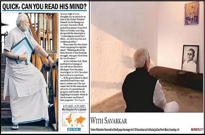प्रधानमंत्री नरेन्द्र मोदी कल पोर्टब्लेयर में थे। वहां उन्होंने सेल्यूलर जेल में हिन्दुत्व विचारक वीर सावरकर को जिस सेल में रखा गया था वहां बैठकर उन्हें याद किया और श्रद्धांजलि दी। एक फोटो उन्होंने इंस्टाग्राम पर शेयर किया जिसे टेलीग्राफ ने निम्न विवरण के साथ पहले पन्ने पर छापा है।