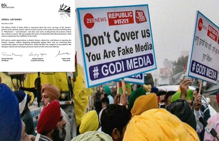 दिल्ली घेर कर बैठे किसानों के निशाने पर मोदी सरकार के अलावा भारत का कथित मुख्यधारा मीडिया भी है। तमाम टीवी चैनल के पत्रकारों को न सिर्फ़ किसान देखते ही खेद दे रहे हैं बल्कि प्लेकार्ड दिखाकर ‘गोदी मीडिया’ को दूर रहने की चेतावनी भी दे रहे हैं। वहीं मीडिया के ऑनलाइन छोटे प्लेटफार्म हाथो हाथ लिये जा रहे हैं। इस सबके बीच एडिटर्स गिल्ड ऑफ़ इंडिया ने कुछ मीडिया संस्थानों की ओर से आंदोलनकारियों को खालिस्तानी और देशद्रोही कहे जाने पर कड़ा ऐतराज़ जताया है।