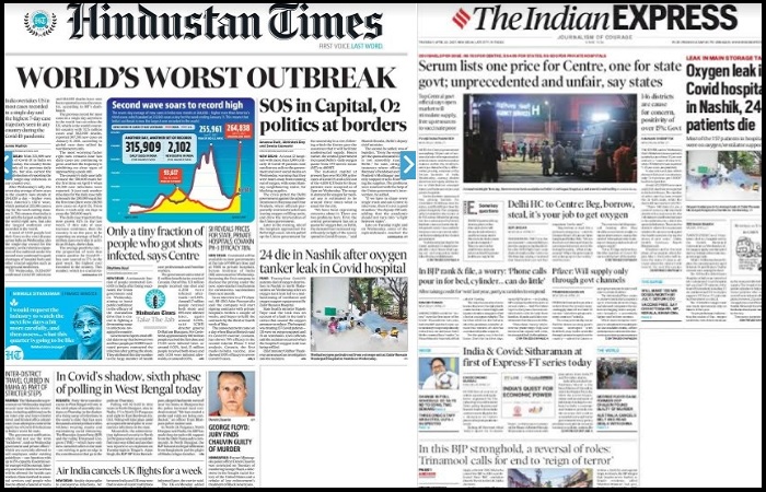 आज की खबर जैसे छपनी चाहिए थी वैसे हिन्दुस्तान टाइम्स ने छापी है। इसमें देश भर में कोरोना की हालत के साथ दिल्ली में ऑक्सीजन की कमी से संबंधित राजनीति की भी खबर है। टाइम्स ऑफ इंडिया में मनीष सिसोदिया का बयान शीर्षक है, “राज्य हमारी आपूर्ति बाधित कर रहे हैं।” वैसे, हिन्दुस्तान टाइम्स की खबर से स्थिति जितनी भयावह है उसे दिखाने के लिए कोई प्रतीकात्मक फोटो नहीं है। इसे आंकड़े और ग्राफ से बताने की गंभीर और वाजिब कोशिश की गई है। हिन्दुस्तान टाइम्स ने अन्य अखबारों से अलग, पहले पन्ने पर तीन कॉलम में यह भी बताया है कि, “कोविड की छाया में आज पश्चिम बंगाल में छठे चरण का मतदान है”।