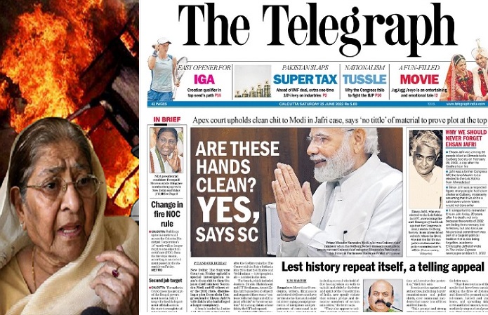 आज के अखबारों में प्रमुख खबर है, सुप्रीम कोर्ट ने गुजरात दंगों में प्रधानमंत्री नरेन्द्र मोदी को क्लीन चिट देने के एसआईटी के फैसले के खिलाफ दायर जकिया जाफरी की अपील को खारिज कर दिया है। आप जानते हैं कि 2002 के दंगों से संबंधित इस मामले में फैसला 2022 में आया है। सुप्रीम कोर्ट ने न सिर्फ अपील को खारिज कर दिया है बल्कि प्रक्रिया के दुरुपयोग का आरोप भी लगाया। इस मामले में आज के अखबारों के शीर्षक से पता चलेगा कि मामला क्या था और किस अखबार ने सुप्रीम कोर्ट के फैसले को कैसे पेश किया है। पेश है, कुछ ई-पेपर के शीर्षक। पहले हिन्दी अखबारों के और फिर अंग्रेजी अखबारों के और अंत में द टेलीग्राफ का शीर्षक। आज इस खबर का मुख्य या सबसे आम शीर्षक है, “जकिया जाफरी को सुप्रीम कोर्ट से भी झटका, मोदी को क्लीन चिट देने के खिलाफ याचिका खारिज।”