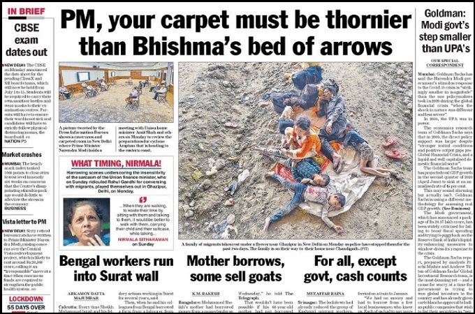 छह कॉलम के इस शीर्षक औऱ डिसप्ले के साथ दो कॉलम की तीन खबरें हैं। बाएं से दाएं इन तीन खबरों का शीर्षक हिन्दी में कुछ इस तरह होता – 1. बंगाल के मजदूरों के लिए सूरत में कोई रास्ता नहीं 2. मां ने उधार लिए, कुछ ने बकरियां बेचीं और 3. सरकार को छोड़कर सबको नकद चाहिए