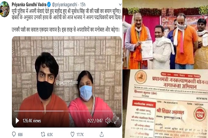 बुलंदशहर में इंस्पेक्टर सुबोध सिंह की हत्या के आरोपी शिखर अग्रवाल को प्रधानमंत्री जनकल्याण योजना का महामंत्री बनाये जाने को लेकर विपक्ष ने बीजेपी पर ज़ोरदार हमला बोला है। प्रियंका गाँधी और अखिलेश यादव ने इसे अपराधियों को योगी राज में मिल रहे सत्ता संरक्षण का नमूना बताया है। प्रियंका गाँधी ने इस सिलसिले में शहीद इंस्पेक्टर सुबोध सिंह की पत्नी रजनी सिंह का एक वीडियो भी ट्वीट किया है जिसमें वे योगी सरकार पर गंभीर आरोप लगा रही हैं। रजनी सिंह ने कहा है कि सरकार एक नया विकास दुबे पैदा कर रही है।