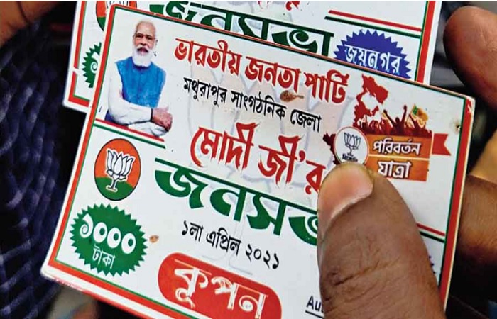 प.बंगाल में सरकार बनाने के प्रधानमंत्री का दावे के पीछे उनका आत्मविश्वास हो सकता है, लेकिन उनकी रैलियों में लोगों को लाने के लिए बाक़ायदा पैसे दिये जा रहे हैं। बीते दिनों 1 अप्रैल को ज्वायनगर में हुई उनकी रैली में शामिल होने के लिए बाक़ायदा ग्रामीणों को एक हज़ार रुपये के कूपन दिये गये। यानी रैली में जाइये और लौटकर कूपन दिखाकर पार्टी से एक हज़ार रुपये ले लीजिए। दक्षिण परगना ज़िले के रायदिगी क्षेत्र के तमाम लोगों को ये कूपन बाँटे गये जहाँ 6 अप्रैल को वोट पड़े।