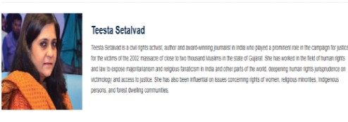 तीस्ता सेतलवाड़, भारत की एक नागरिक अधिकार कार्यकर्ता, लेखिका और पुरस्कृत पत्रकार हैं – जिन्होंने 2002 में दो हज़ार के लगभग मुस्लिमों के जनसंहार के पीड़ितों को न्याय दिलाने की मुहिम में अहम किरदार निभाया। उन्होंने भारत और अन्य देशों में मानवाधिकार और क़ानूनों के क्षेत्र में बहुसंख्यकवाद और धार्मिक कट्टरता की पोल खोलने का काम कर के – मानवाधिकार न्याय और पीड़ितों की न्याय तक पहुंच बनाने के उद्देश्य को और गहरा किया है। वे महिला अधिकार, धार्मिक अल्पसंख्यकों, मूल निवासियों और वनवासियों के मुद्दों पर भी प्रभावी और मुखर हैं।