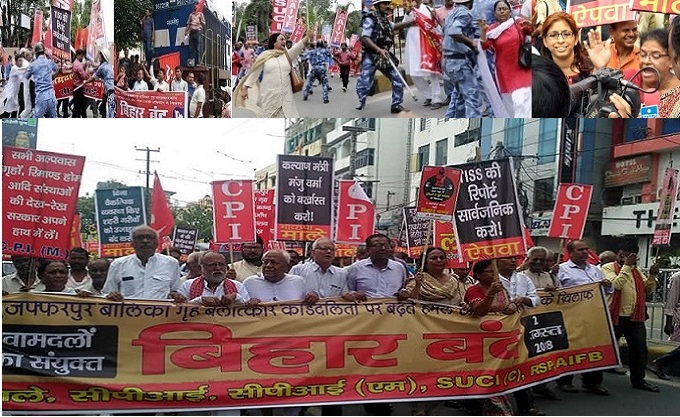 पटना. वाम दलों द्वारा आहूत आज के बिहार बंद का व्यापक असर देखा गया। कई स्थानों पर रेलवे के परिचालन को बाधित किया गया है, तो राष्ट्रीय व राज्य पथों पर भी जगह-जगह बंद समर्थकों ने जाम लगाया. समाज के विभिन्न तबके के लोगों ने मुजफ्फरपुर यौन उत्पीड़न व बिहार में दलित-गरीबों पर हमले के खिलाफ आयोजित आज के बिहार बंद को सक्रिय समर्थन दिया.