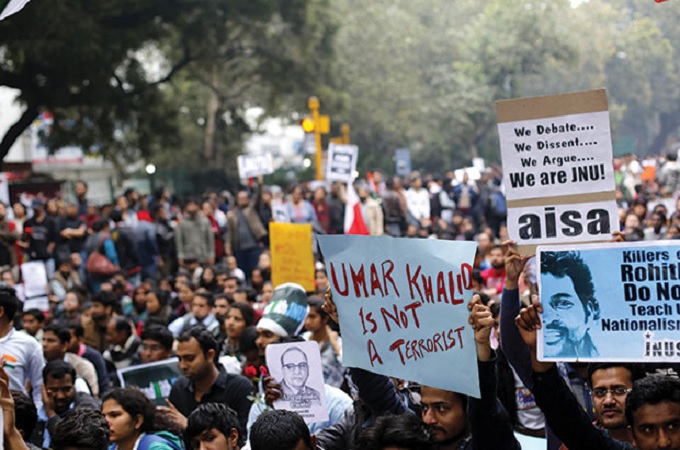 मोदी सरकार के सत्ता में आने के साल भर बाद आरएसएस के मुखपत्र ‘पाँचजन्य’ ने नवंबर 2015 में अपनी एक कवर स्टोरी में जेएनयू को ‘‘दरार का गढ़’’ बताते हुए लिखा कि भारत की अखण्डता व देशभक्ति के लिए यह विश्वविद्यालय सबसे बड़ा खतरा है। खतरा इसलिए कि यहाँ दलितों, आदिवासियों, स्त्रियों, अल्पसंख्यकों के सवालों पर न केवल बात-बहस होती है बल्कि यहां के पाठ्यक्रम में इन तबकों की ऐतिहासिक सामाजिक दशा-दुर्दशा पर केन्द्रित कोर्स स्वीकृत हैं, जहां सेमिनार हो रहे हैं, परचे पढ़े-सुने जा रहे हैं, हर साल एमफिल पीएचडी की-कराई जा रही है। वंचितों के अधिकार की, समानता की, बराबरी की, आज़ादी की बात उठती है तो ‘एक भारत’ को चोट लगती है, ‘समर्थ भारत’ की पोल खुलती है यानी ‘अखण्ड भारत’ की खोट दिखने लगती है। भूख भय का प्रश्न उठता है, भेदभाव से पोषित सिस्टम को समूल बदलने की बात की जाती है तो हिंसा हत्या पर टिकी सत्ताकामी देशभक्ति के दो-मुँहेपन पर बाएं बाजू के गगनभेदी मुक्के पड़ते हैं। सबको रोजगार देने की मांग की जाती है तो अ-समानता के ‘श्रेष्ठ’ लाभार्थी तिलमिलाने लगते हैं। यहां तेभागा, तेलंगाना, नक्सलबाड़ी के शहीदों को रेड सैल्यूट पेश किया जाता है तो चौड़ी छाती वाले ‘महान’ भारत की आंतरिक सुरक्षा का नाड़ा ढीला हो जाता है और भगत सिंह का नाम सुनते ही ‘‘सामाजिक समरसता’’ की साम्प्रदायिक हज़मियत खजमजा उठती है। इसीलिए जेएनयू ‘‘दरार का गढ़’’ है क्योंकि यहां ‘‘राष्ट्र को तोड़ने’’ की नित नई कसमें बुनी जा रही हैं, क्योंकि यहां ‘‘भारत की बर्बादी’’ के लाल लाल सपने देखे जा रहे हैं!