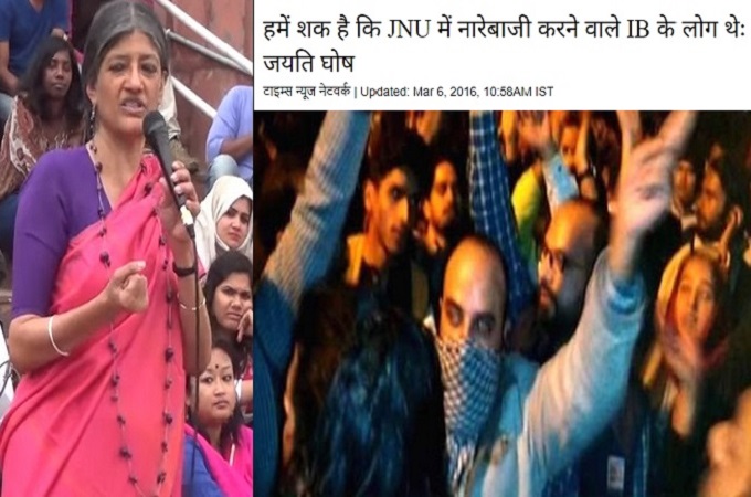 कहीं ऐसा तो नहीं कि प्रो.जयति घोष का आरोप सही है। मशहूर अर्थशास्त्री और जेनयू में तीस साल से पढ़ा रहीं प्रो.जयति घोष ने ‘आल्टरनेटिव क्लास’ शृंखला के तहत परिसर में 5 मार्च 2016 को दिए गए अपने लेक्चर के बाद साफ़ कहा था कि देशविरोधी नारेबाज़ी करने वाले दरअसल आई.बी. के लोग थे और यह जेएनयू को बदनाम करने की बड़ी मुहिम के तहत किया गया। उन्होंने आरोप लगाया था कि सरकार हर उस व्यक्ति और संस्था को ‘देशद्रोही’ कहकर निशान बना रही है जो सरकार की दमनकारी और जनविरोधी नीतियों का विरोध करते हैं। चूँकि जेएनयू प्रतिवाद का बड़ा केंद्र है, इसलिए वह केंद्र सरकार के निशाने पर ख़ासतौर से है। इस संबंध में 6 मार्च 2016 को नवभारत टाइम्स में छपी ख़बर आप यहाँ पढ़ सकते हैं।