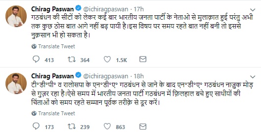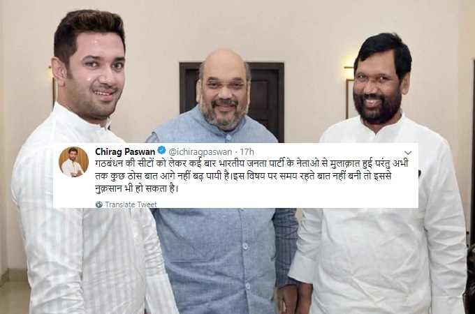 उधर, पार्टी ने स्पष्ट किया है कि यह ट्वीट चिराग की व्यक्तिगत राय नहीं है। पूरी पार्टी ऐसा ही सोचती है। बुधवार को रामविलास पासवान के भाई और पार्टी नेता पशुपति पारस ने अल्टीमेटम दिया कि अमित शाह 31 दिसंबर तक फैसला लें। उन्होंने यह भी कहा पार्टी को लोकसभा चुनाव में में 7 सीटों में एक भी कम मंजूर नहीं है।