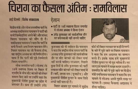 गौर करने की बात यह है कि नितीश कुमार की एनडीए में वापसी के बाद एलजेपी की यह माँग पूरी करना बीजेपी के लिए संभव नहीं लगता। संदेह नहीं कि राजनीति के बदलते मौसम को पासवान पिता-पुत्र बहुत बारीक़ी से परख रहे हैं। पल्टी मारना वे हमेशा ही स्वास्थ्यके लिए बेहतर मानते रहे हैं। ऐसे में 2019 चुनाव के पहले अगर लोजपा एनडीए से अलग हो जाए तो किसी को आश्चर्य नहीं होगा