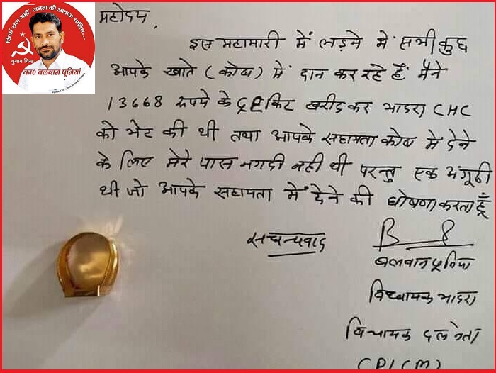 कोरोना से जंग में संसाधन जुटाने के लिए यूं तो बड़े-बड़े दानवीर नाम कमा रहे हैं, लेकिन राजस्थान के भादरा के सीपीएम विधायक बलवान पूनिया ने दिल जीत लेने वाला काम किया है। उन्होंने अपने पास मौजूद सारी नगदी मेडिकल सुरक्षा किट खरीदने में खर्च कर दी थी, ऐसे में मुख्यमंत्री राहत कोष में देने के लिए उनके पास एक सोने की अंगूठी ही बची थी। यह अंगूठी भी उन्होंने दान कर दी।