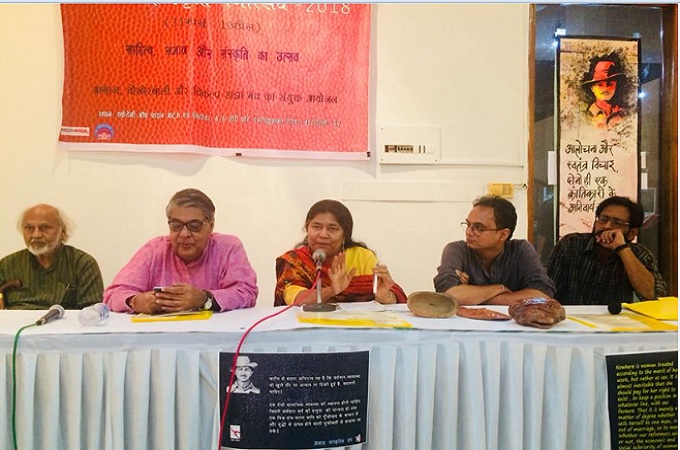 पहले सत्र “साहित्य का ‘स’ और क्रांति का ‘क’ में बोलते हुए प्रो अली जावेद ने उर्दू साहित्य में प्रतिरोध की परंपरा पर विस्तार से बात की। प्रसिद्ध कहानीकार और संस्कृतिकर्मी नूर ज़हीर ने धर्म और कट्टरवाद के प्रतिरोध को साहित्य की ज़रूरी कार्यवाही बताते हुए कहा कि भगतसिंह द्वारा लिखा गया लेख ‘मैं नास्तिक क्यों हूँ’ को समाज के कोने-कोने में पहुँचाना ज़रूरी है। नास्तिकता को बढ़ाया जाना ही इस अन्धविश्वास से बाहर निकलने का एक मात्र रास्ता है।” प्रख्यात कवि राजेश जोशी ने कहा कि “प्रतिरोध की आवाज जैसे ही कानों तक पहुंचती है सत्ता अपना काम करने लगती है। प्रतिरोध की आवाज ऊँची हो रही है इसका मतलब है कि जनता मज़बूत हो रही और जब भी जनता मज़बूत होती है सत्ता और भी मज़बूती से दमन करती है।” चार्ली चैपलिन और ब्रेख्त ने बताया था कि प्रतिरोध चीख़ कर नहीं हो सकता। जनता की मज़बूती ही प्रतिरोध के आवाज को बुलंद कर सकती है और इसमें सबसे ज्यादा योगदान साहित्य का ही होता है। उन्होंने हास्य के महत्व को बताते हुए कहा कि हास्य सत्ता को हिलाने का दम रखता है। वर्तमान सरकार को निशाने पर लेते हुए कई चुटकुले भी सुनाए और मजाकिया लहजे में सरकार को ढाई आदमी की सरकार बताया।धर्म और आस्तिकता को अलग करके देखने की ज़रूरत पर ज़ोर देते हुए उन्होने कहा कि पत्थर पर सर पीटने वाला आदमी आस्तिक तो है परन्तु धार्मिक नहीं है। श्रोताओं के सवालों का जवाब देते हुए राजेश जोशी ने भगतसिंह के मजबूत विचार का जिक्र किया और उन्होंने कहा कि अगर भगतसिंह को फांसी नहीं होती तो उन्हें मारे जाने की कोशिश होती क्योंकि अंग्रेजों ने 1917 की क्रांति को देखा था। भगतसिंह में उस तरह के क्रांति लाने की क्षमता थी। इस बात से अंग्रेज वाकिफ हो गए थे, इसलिए अंग्रेज नहीं चाहता थे कि दूसरा लेनिन पैदा हो, गांधी मजदूर के नेता नहीं हो सकते क्योंकि उन्होंने कभी मजदूर को प्रमोट नहीं किया। सत्र का संचालन करते हुए युवा कवि और लेखक अशोक कुमार पाण्डेय ने समकालीन साहित्य में बढ़ती हुई अराजक प्रवृत्तियों पर चिंता प्रकट की।