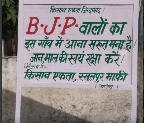 गांधी जयन्ती पर किसान क्रांति यात्रा के साथ दिल्ली-यूपी के बॉर्डर पर हुई पुलिसिया ज्यादती के बाद जब किसान अपने-अपने गांवों को अब लौट गए हैं, तो दिल्ली पुलिस के किए सुलूक का असर उनके गांवों की सरहद पर दिखने लगा है। अमरोहा जिले के एक गांव रसूलपुर माफ़ी में किसानों ने गांव के बाहर स्कूल के पास एक बोर्ड तानकर भारतीय जनता पार्टी को चेतावनी जारी कर दी है।