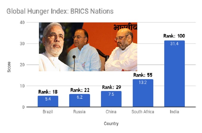 हम सब नासमझ मंदी की बात कर रहे हैं जबकि वैश्विक भूख सूचकांक में भारत 2014 में 55 वें स्थान पर थे अब 100 वें स्थान पर है| 3 साल में 45 स्थान नीचे – इतना तेज विकास मोदी के अलावा कौन कर सकता था? विश्व की सबसे तेज अर्थव्यवस्था!