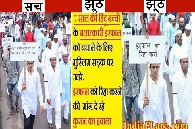 मंदसौर मे जो जुलूस निकाला गया, उसमें प्रदर्शनकारी जो तख्तियां लेकर चल रहे थे, उनमें लिखा था कि ‘‘हम अपनी बच्चियों पर इस तरह के हमले सहन नहीं करेंगे। इस क्रूरता को रोका जाए‘‘। एक ट्वीट में कहा गया कि ‘‘एनसीआरबी (राष्ट्रीय अपराध अभिलेख ब्यूरो) की एक रपट के अनुसार, भारत, महिलाओं के लिए सबसे असुरक्षित देश है। भारत में बलात्कार के 95 प्रतिशत मामलों में आरोपी मुसलमान होते हैं। देश में बलात्कार की कुल 84,734 घटनाओं में से 81,000 में आरोपी मुसलमान हैं और 96 प्रतिशत पीड़ित, गैर-मुस्लिम हैं। मुसलमानों की आबादी में वृद्धि के साथ बलात्कार भी बढ़ेंगे‘‘।