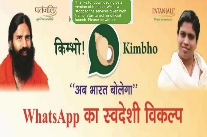 पतंजलि के प्रवक्ता ने यह ट्वीट किया। 30 मई, 2018 को, बाबा रामदेव की कंपनी पतंजलि ने किम्भो नामक एक मैसेजिंग ऐप लॉन्च किया है। किम्भो को व्हाट्सएप को टक्कर देने के लिए स्वदेशी विकल्प के रूप में बताया गया है, जो पतंजलि उत्पादों के ‘राष्ट्रवादी’ ब्रांडिंग के अनुरूप है।